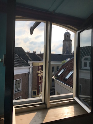 Wednesday was another ambling around Deventer day. Irina and I went off to various shops to pick up so specialty cheese and wurst to take to Sara & Co. on my next stop. (Also some cheese for me to take home, once I'd verified that their packaging technique would pass customs.) Then just more wandering with tour guide: tracing the old city walls (both the earthwork built against the Vikings and the medieval stone wall that can still be seen in fragments and lasted into the early 17th century (IIRC). Met the rest of the household at De Rode Kater (The Red Cat) for lunch, which was also where Irina and I returned for dinner. We also enjoyed a long pleasant evening on the rooftop patio, watching the bat go after insects and discussing books and philosophy and whatnot.