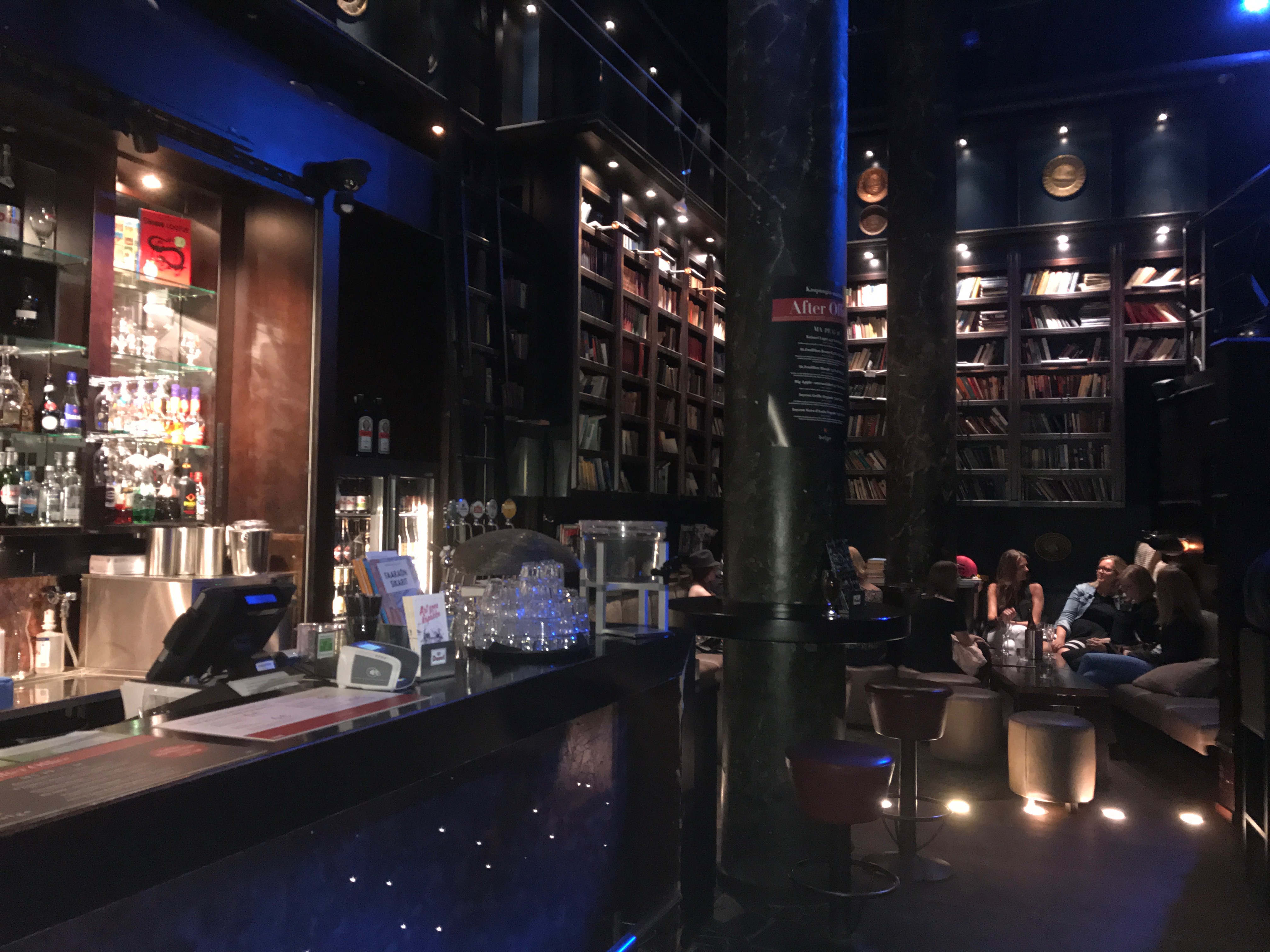 The photo is of the Belge Cafe where I had dinner in company with a number of other denizens of the File 770 blog, once more including my first face-to-face meeting with someone I've known online since Usenet days (Anna Feruglio Dal Dan). The cafe has a "library" theme, which was part of the attraction, though the food was also excellent. But I get ahead of myself.